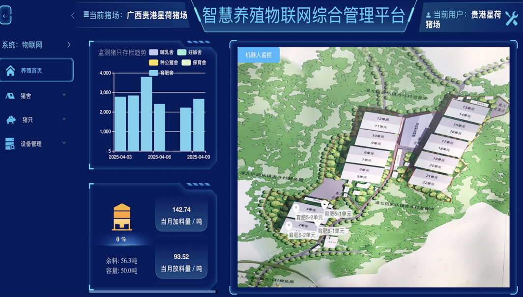 贵港市星荷AI聪慧猪场位于港北区武乐镇吉斗村,通过物联网手艺、聪慧猪舍建制和AI智能化系统架构实现育猪数字化办理,养殖密度低于0。85㎡/头,人均豢养量高于4000头,成活率高于97%,料肉比低于2。5,豢养时间缩短至158天,可间接降低每头猪的豢养成本至多220元。中国年消费生猪约7亿头,育肥猪占领次要市场份额但财产结构失衡。头部企业90%资本集中于种猪繁育范畴,而育肥猪产能一半以上都是来自存栏量500以下的散养农户、小型养殖场。这种分离化养殖模式导致出产效率低下,且正在尺度化出产、污染防治、疫病防控和食物平安等方面存正在系统性风险。